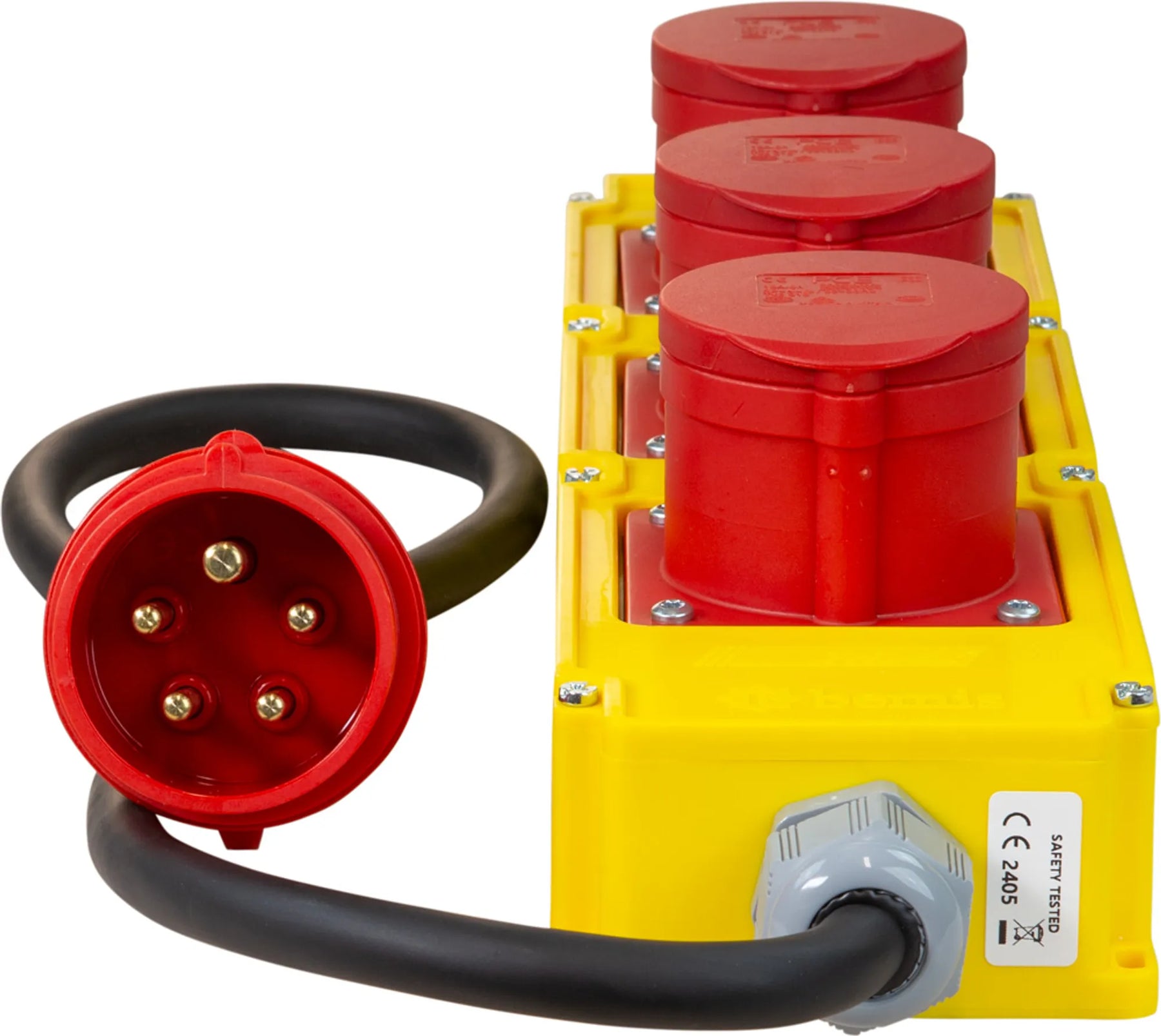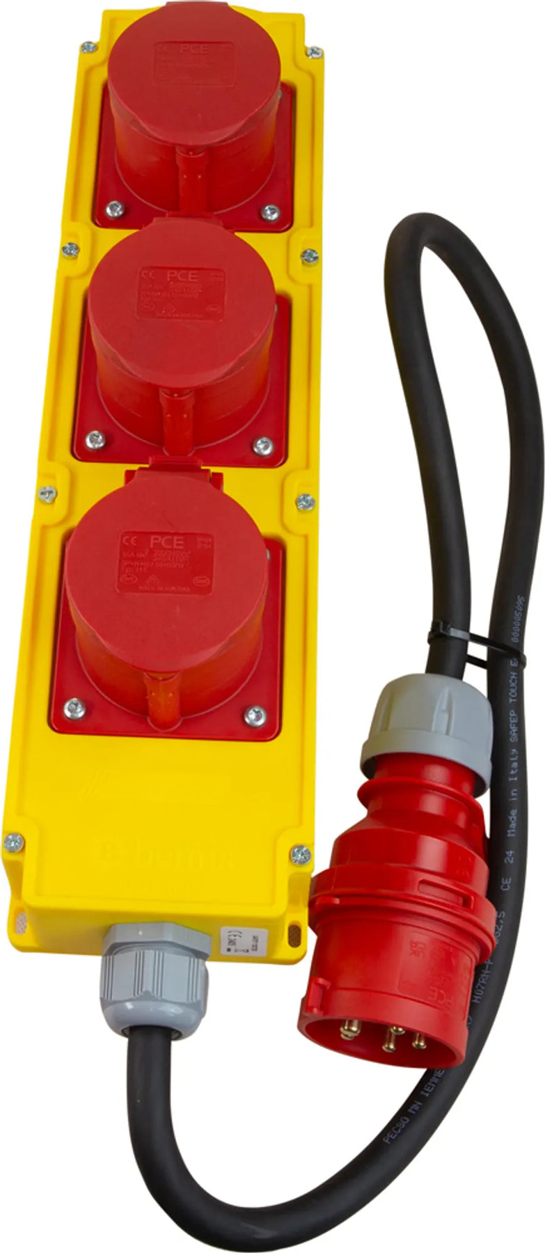 Grenuttag 16A/400V 3-vägs CEE. Monterad med stickpropp CEE 416-6. Monterad med 1m extra förstärkt gummikabel H07RN-F 5G2,5. Grenuttaget är tillverkat i slagtålig polyamid.