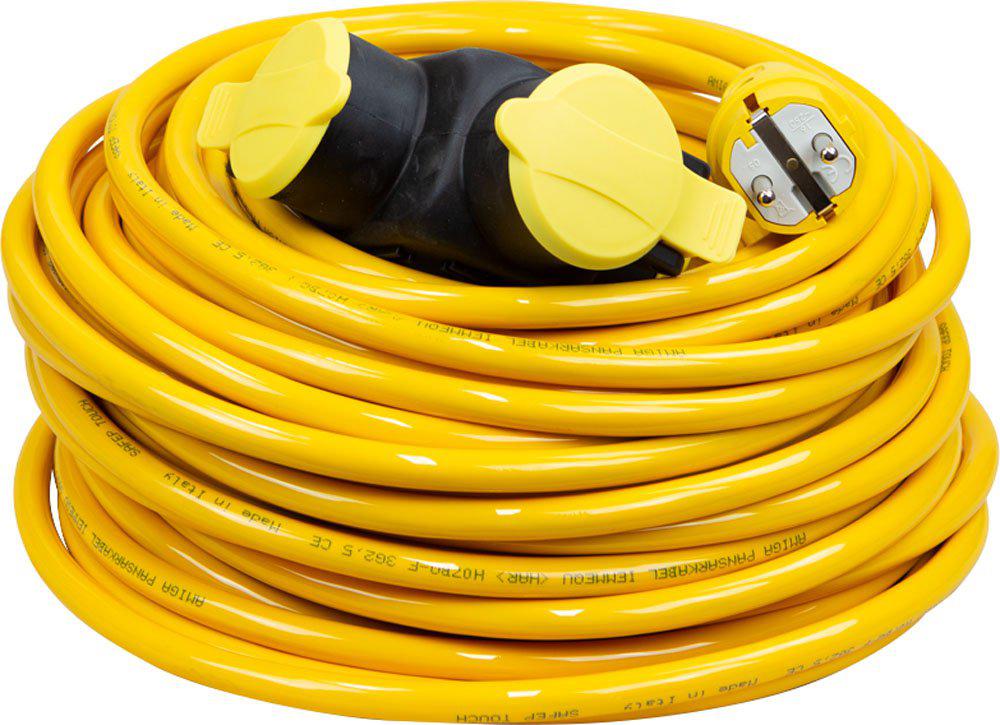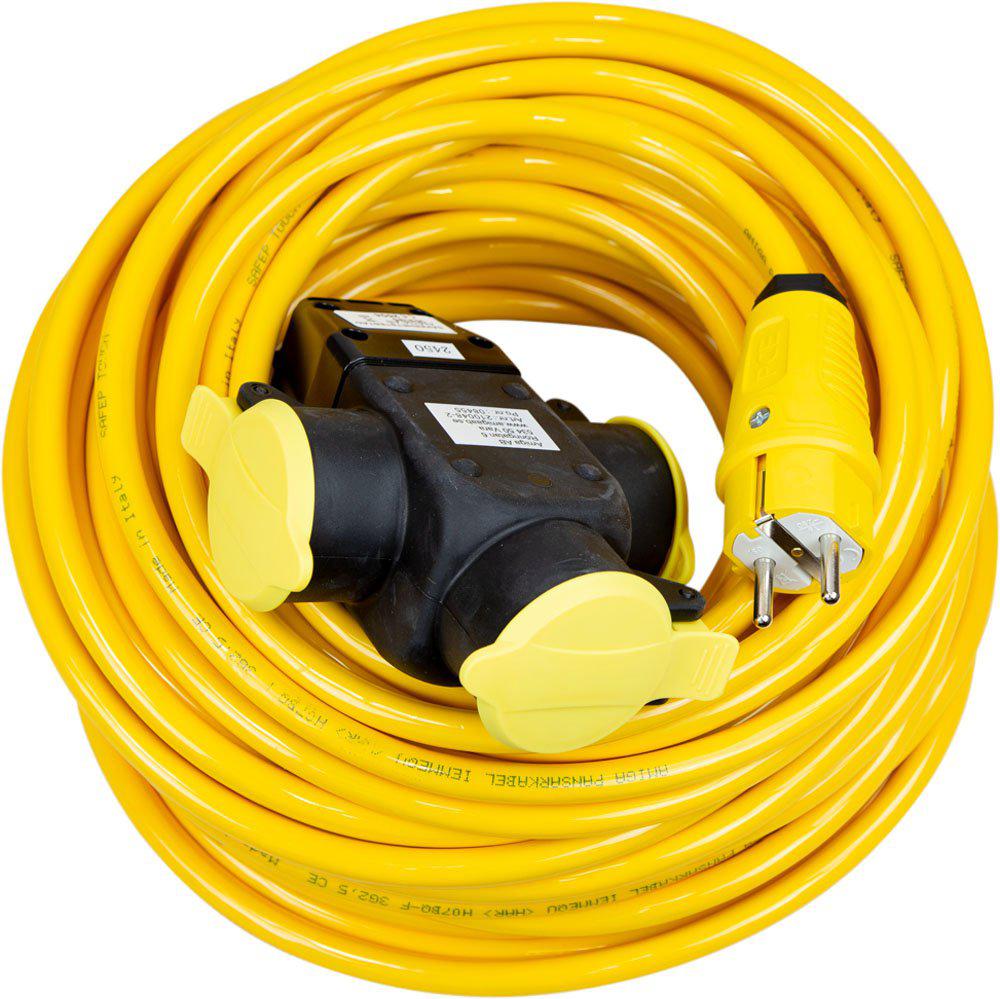 Grenuttag 16A/230V 3-vägs tillverkad i slagtålig polykarbonat. Monterad med 25m polyuretanmantlad kabel H07BQ-F. Framtagen med hänsyn till flexibilitet och böjlighet i kyla och för att klara höga mekaniska belastningar vid industriell drift med nötande påfrestningar. Monterad med Schukostickpropp.