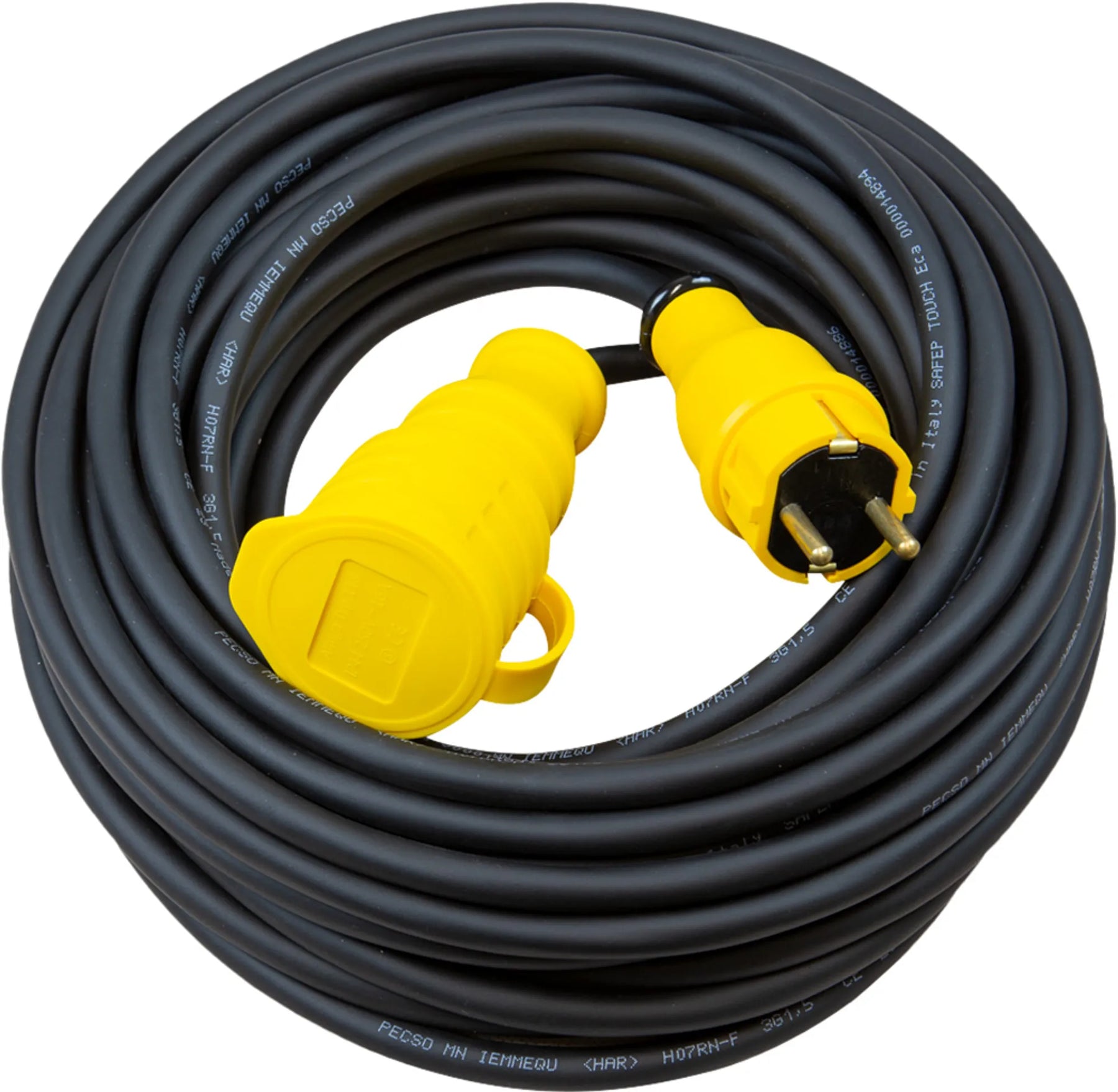 Skarvkabel gummi 16A/230V. Extra förstärkt gummikabel. Framtagen med hänsyn till flexibilitet och böjlighet i kyla. Monterad med slagtåliga, oljebeständiga uttagsdon i signalfärg. Godkänd för utomhusbruk. Anpassad för industrier och byggarbetsplatser då Schukouttaget inte har petskydd. 25M. Svensktillverkad.