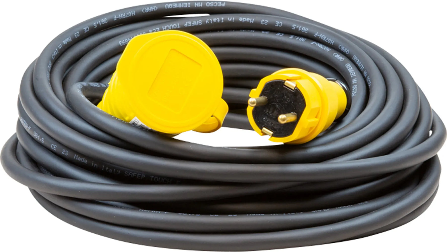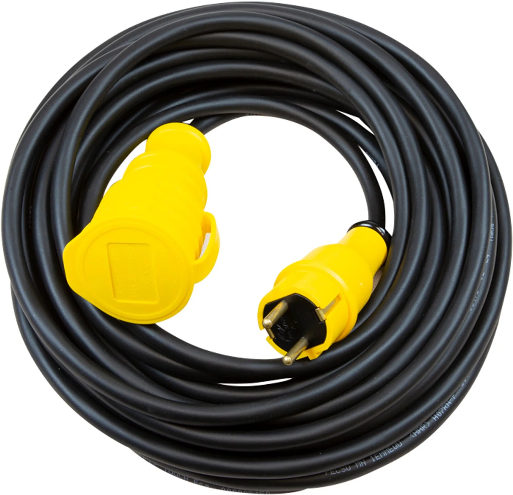 Skarvkabel gummi 16A/230V. Extra förstärkt gummikabel. Framtagen med hänsyn till flexibilitet och böjlighet i kyla. Monterad med slagtåliga, oljebeständiga uttagsdon i signalfärg. Godkänd för utomhusbruk. Anpassad för industrier och byggarbetsplatser då Schukouttaget inte har petskydd. 15M. Svensktillverkad.