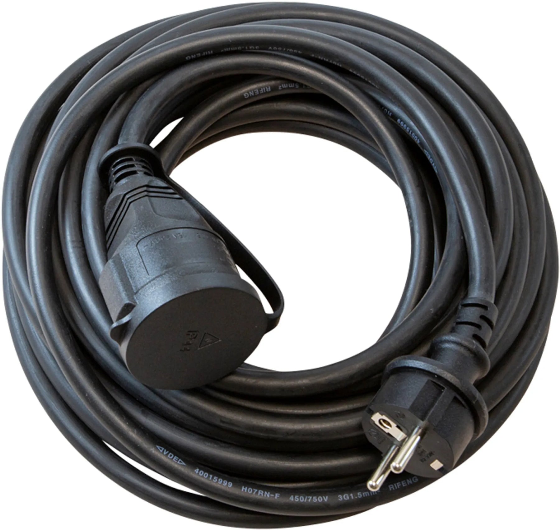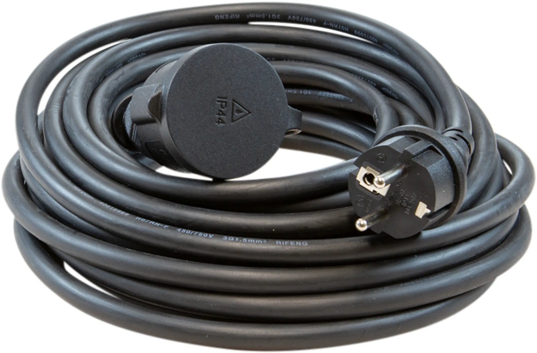 Skarvsladd gummi 16A/230V. Godkänd för utomhusbruk. IP44. Jordad med petskydd och lock. Färg: Svart Typ: H07RN-F 3G1.5 Mått: 10 m