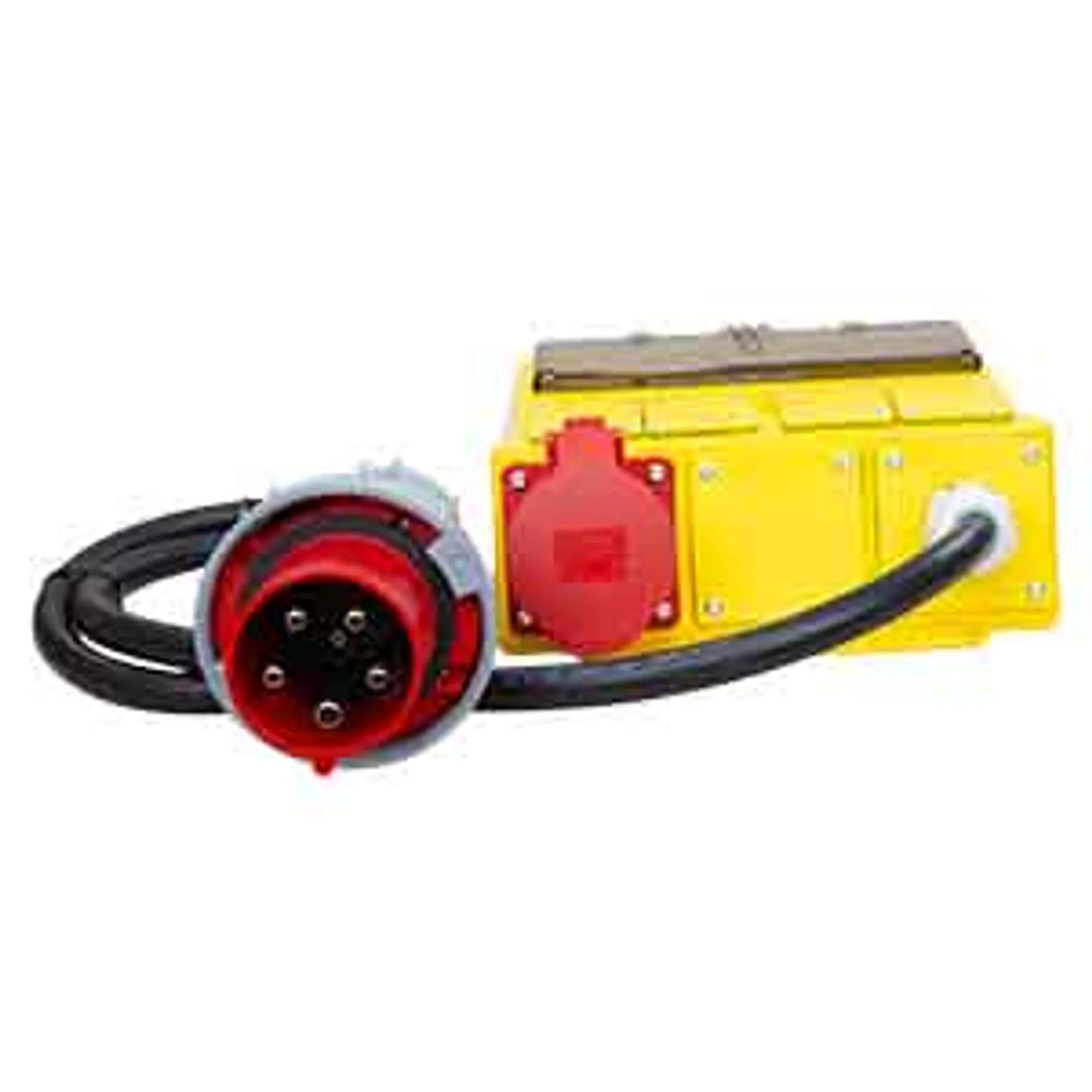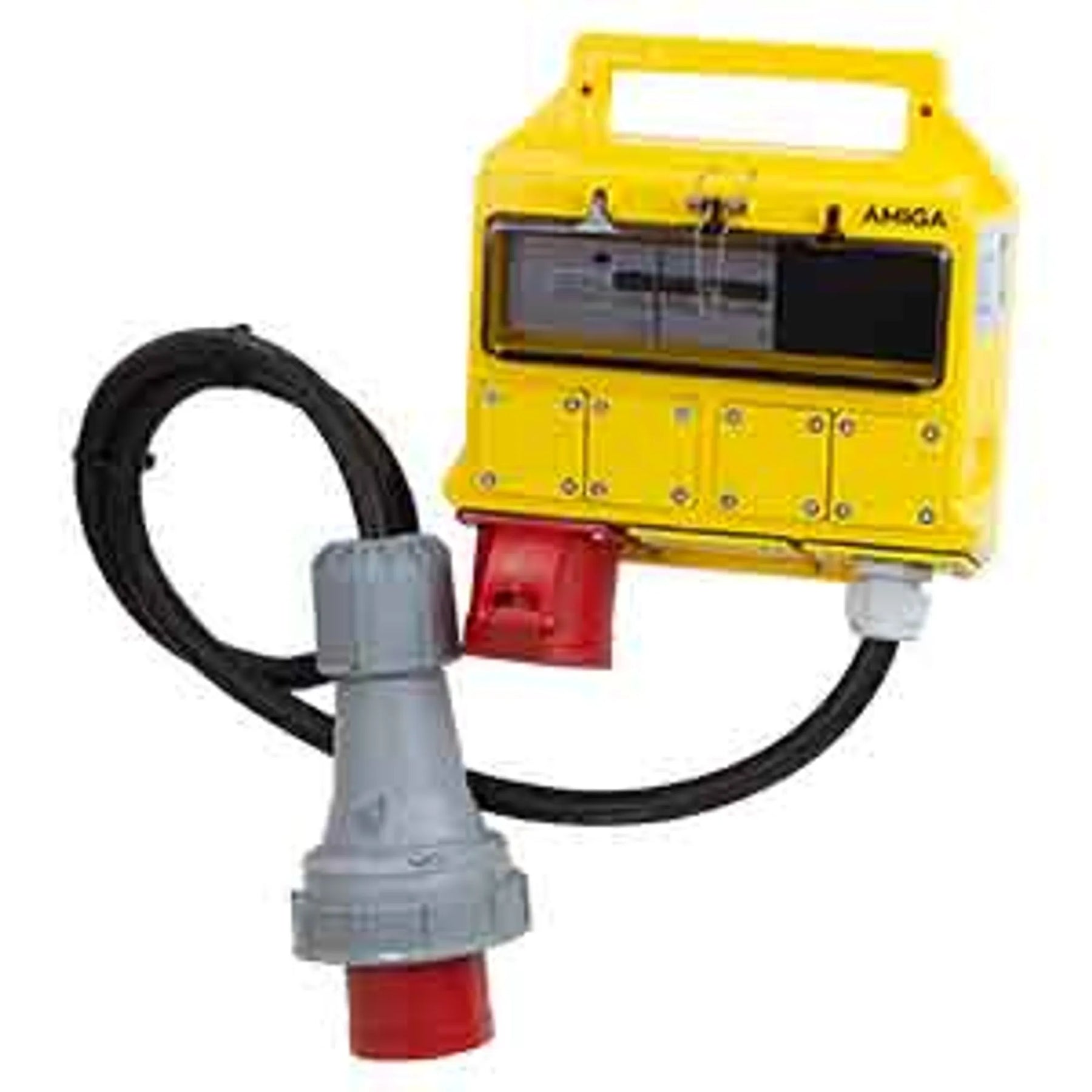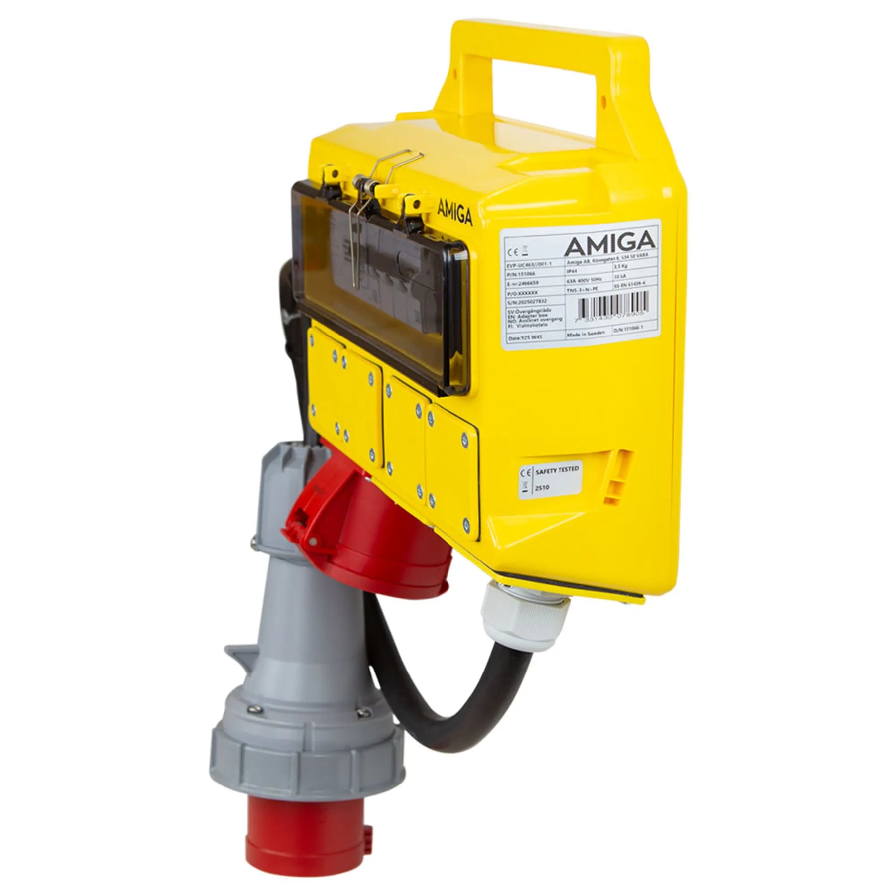 Enheten är utrustad med ett uttag, CEE432 400V säkrat med en 3-polig 32A automatsäkring och för ökat personskydd en 4-polig 40A 30mA jordfelsbrytare.