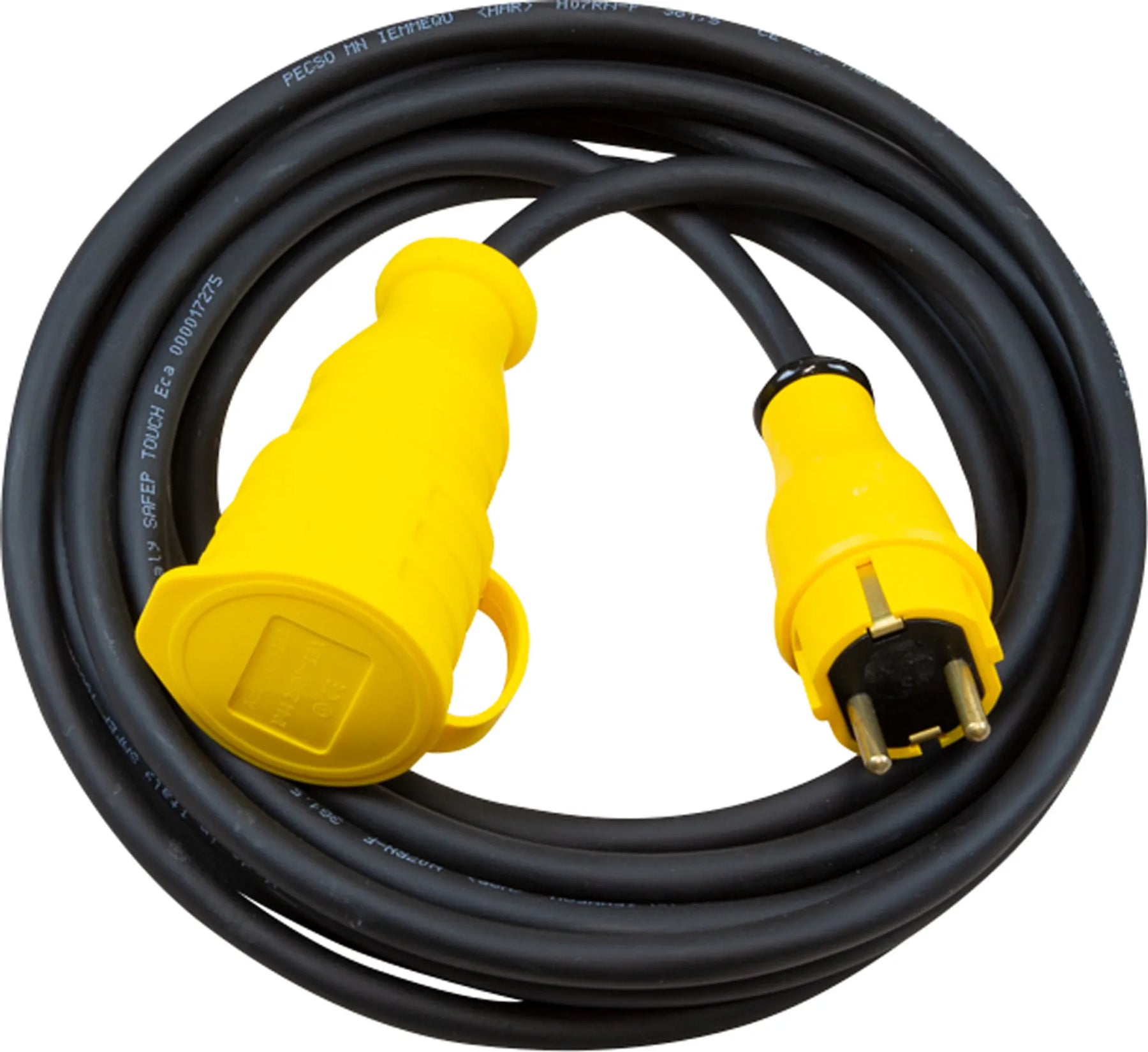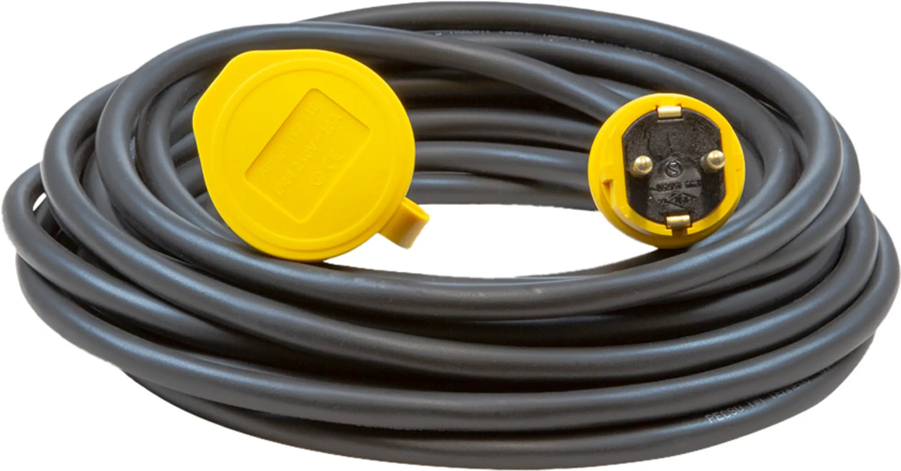 Skarvkabel gummi 16A/230V. Extra förstärkt gummikabel. Framtagen med hänsyn till flexibilitet och böjlighet i kyla. Monterad med slagtåliga, oljebeständiga uttagsdon i signalfärg. Godkänd för utomhusbruk. Anpassad för industrier och byggarbetsplatser då Schukouttaget inte har petskydd. 10M. Svensktillverkad.