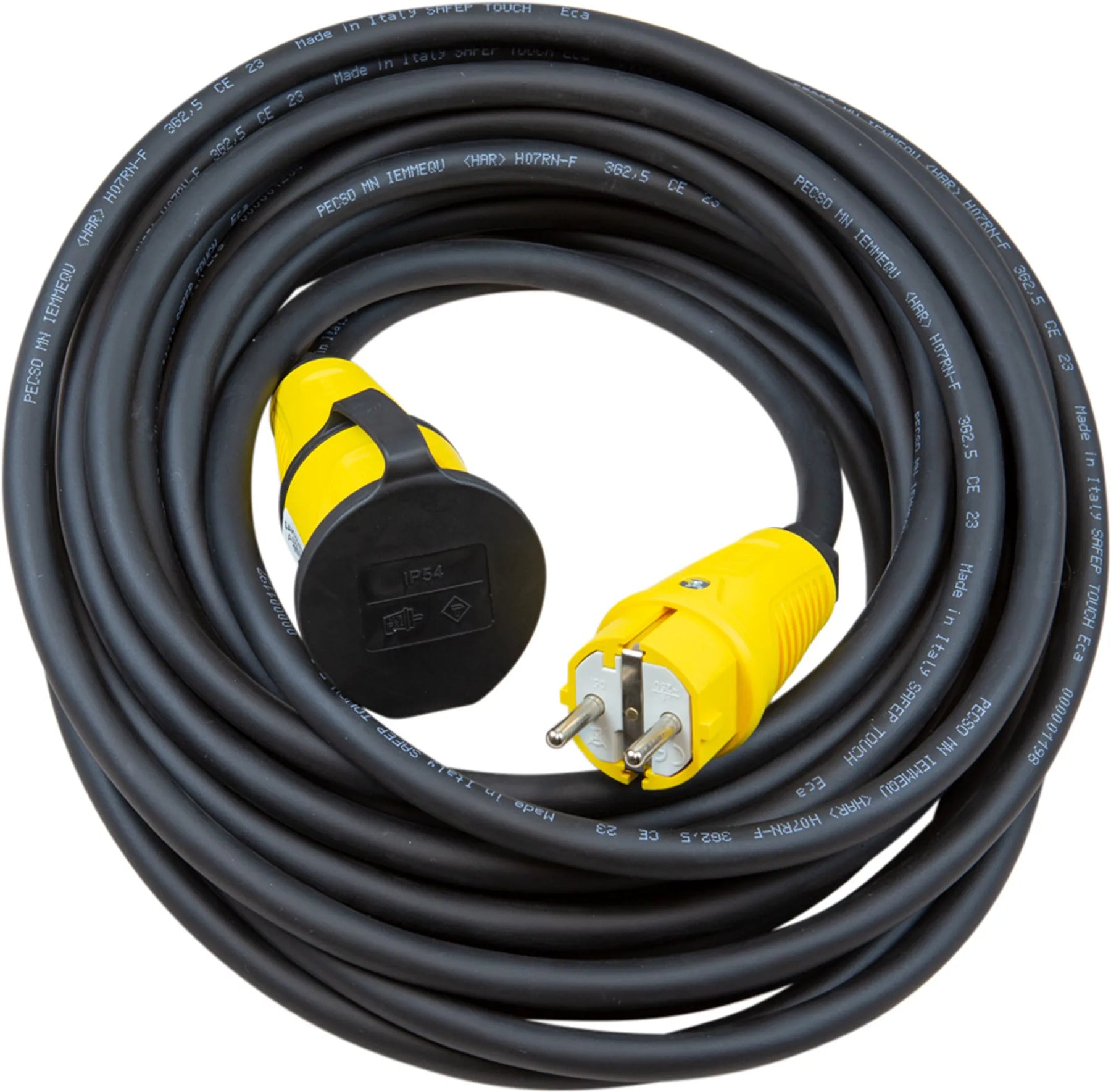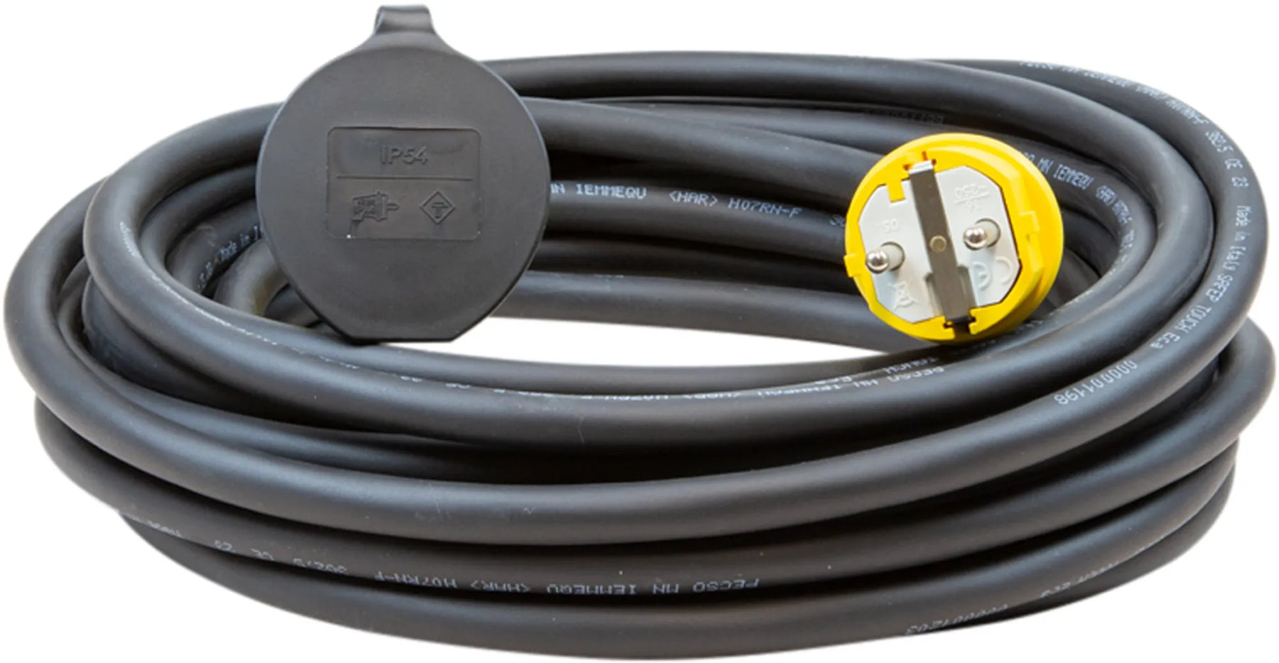 Skarvkabel gummi 16A/230V. Extra förstärkt gummikabel. Framtagen med hänsyn till flexibilitet och böjlighet i kyla. Monterad med slagtåliga, oljebeständiga uttagsdon i signalfärg. Godkänd för utomhusbruk. Lämplig för värmefläktar, högtryckstvättar, kompressorer mm. Anpassad för industrier och byggarbetsplatser då Schukouttaget inte har petskydd. 10M. Svensktillverkad.