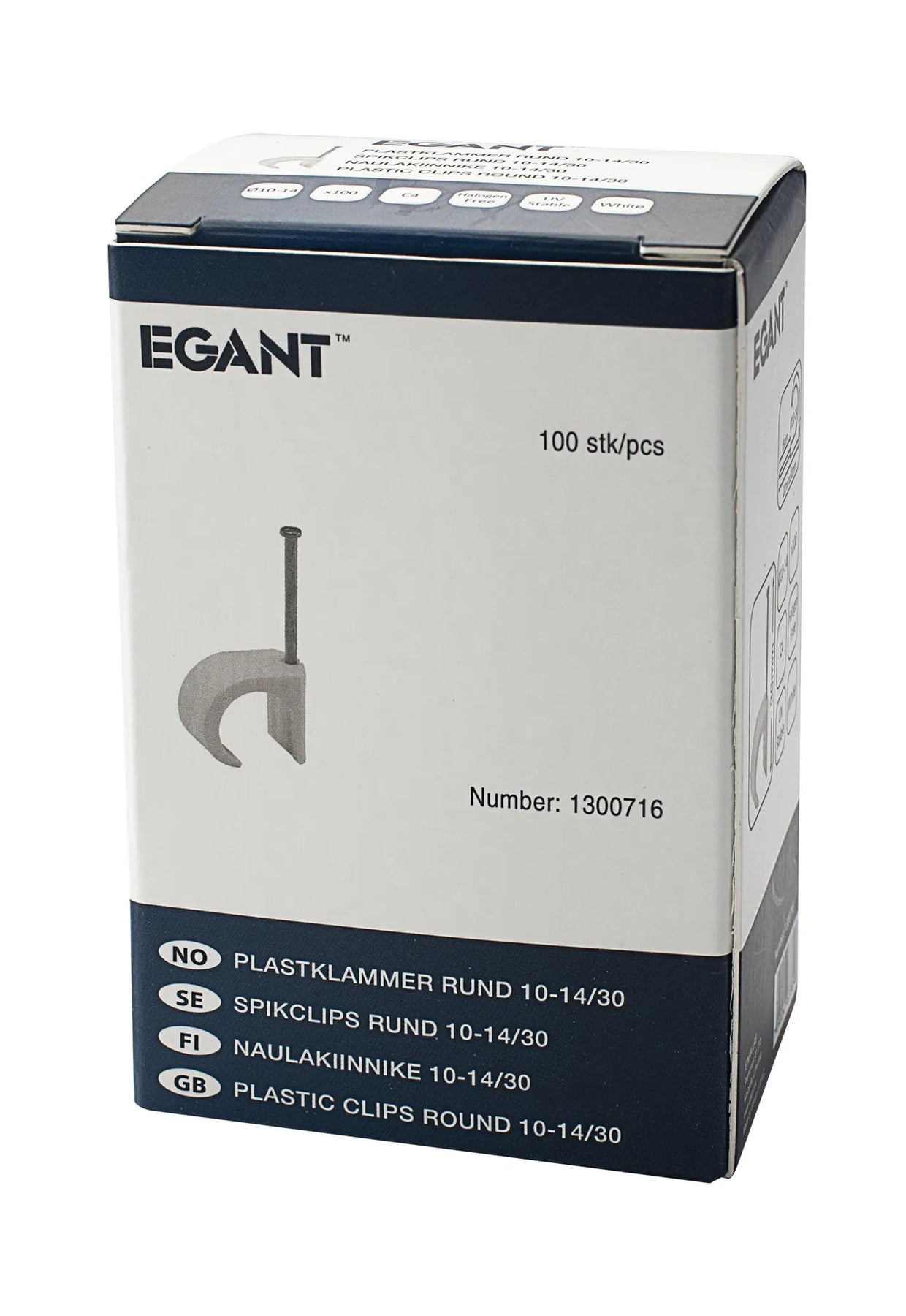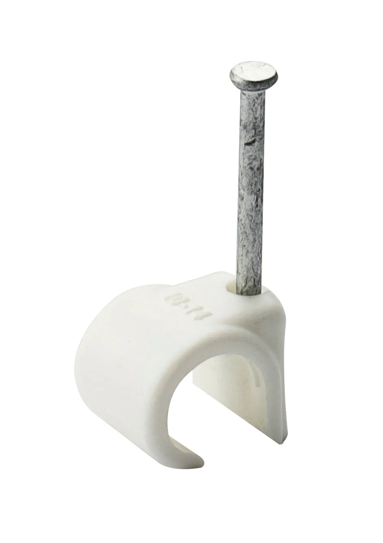 Spikklammer för 10-14 mm rund ledning. Klammer av vit UV-beständig plast med förstärkt 30 mm stålstift. Halogenfri med korrosionsklass C4.